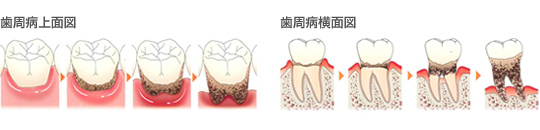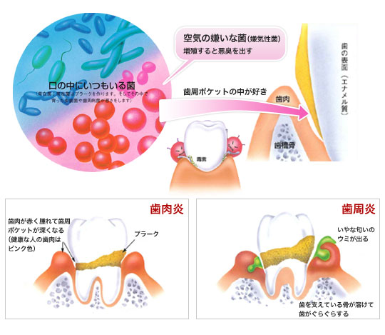 歯周病は成人の80%以上がかかっているといわれている病気です。特に40歳代から知らず知らずに進んでしまっている場合があります。原因は口の中にいる歯周病菌(Porphyromonas gingivalis, Actinobacillus actinomycetemcomitans など)が、食物残渣などを栄養とし、増殖し、その菌が出す代謝産物によって、歯肉が腫れ、歯を支えている骨が結果的にとけてしまう病気です。